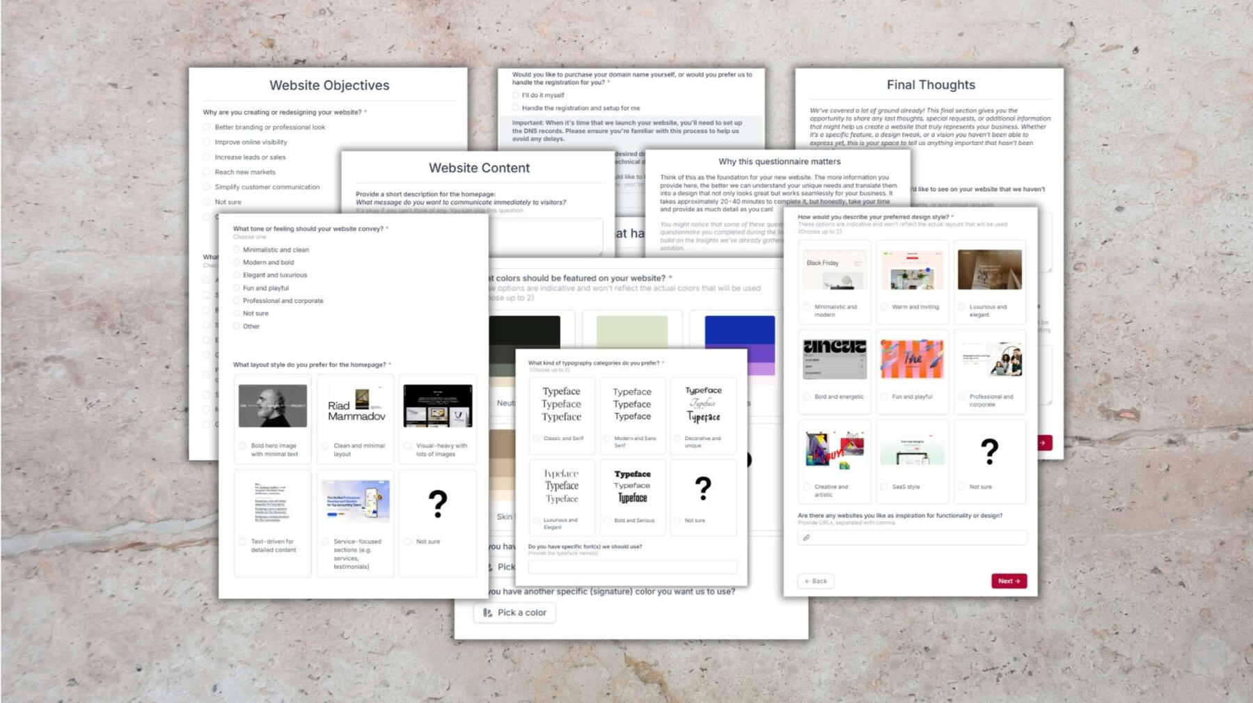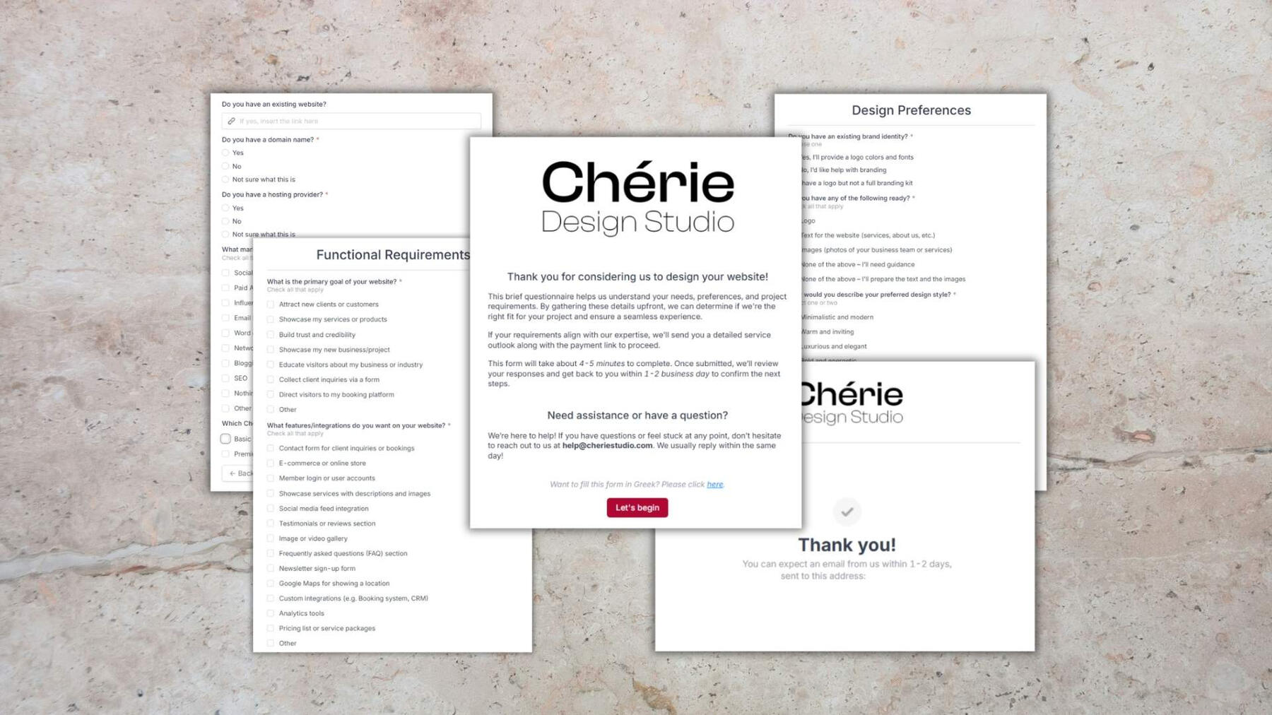 Τώρα που ξεκινήσαμε επίσημα τη συνεργασία μας, θα σας στείλουμε το αναλυτικό Ερωτηματολόγιο Εισαγωγής Πελάτη. Σε αυτό συγκεντρώνουμε όλα τα στοιχεία που χρειαζόμαστε για να ζωντανέψουμε την ιστοσελίδα σαςμ πληροφορίες για την επιχείρησή σας, το κοινό σας, το ύφος του brand σας και το περιεχόμενο ή τις εικόνες που θέλετε να συμπεριλάβουμε.Μην ανησυχείτε αν δεν έχετε όλες τις απαντήσεις έτοιμες· είμαστε εδώ για να σας καθοδηγήσουμε σε κάθε βήμα.